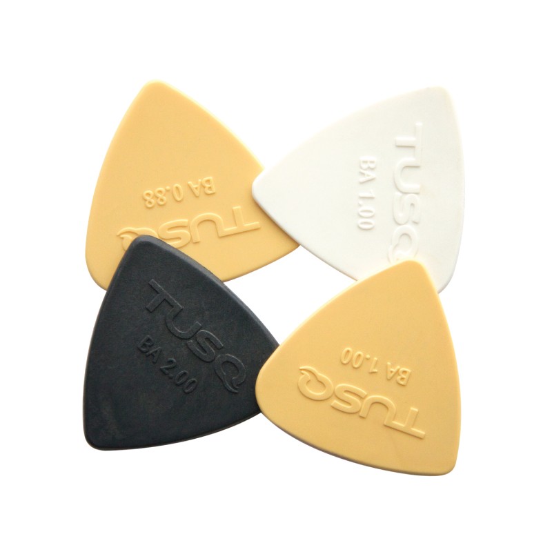 Les picks TUSQ sont formulés de plusieurs matériaux composite qui offrent des caractérisstiques résonnantes interessantes, ils ont disponible en 3 version de sonorité Bright (blanc), Warm(beige) Deep(gris).